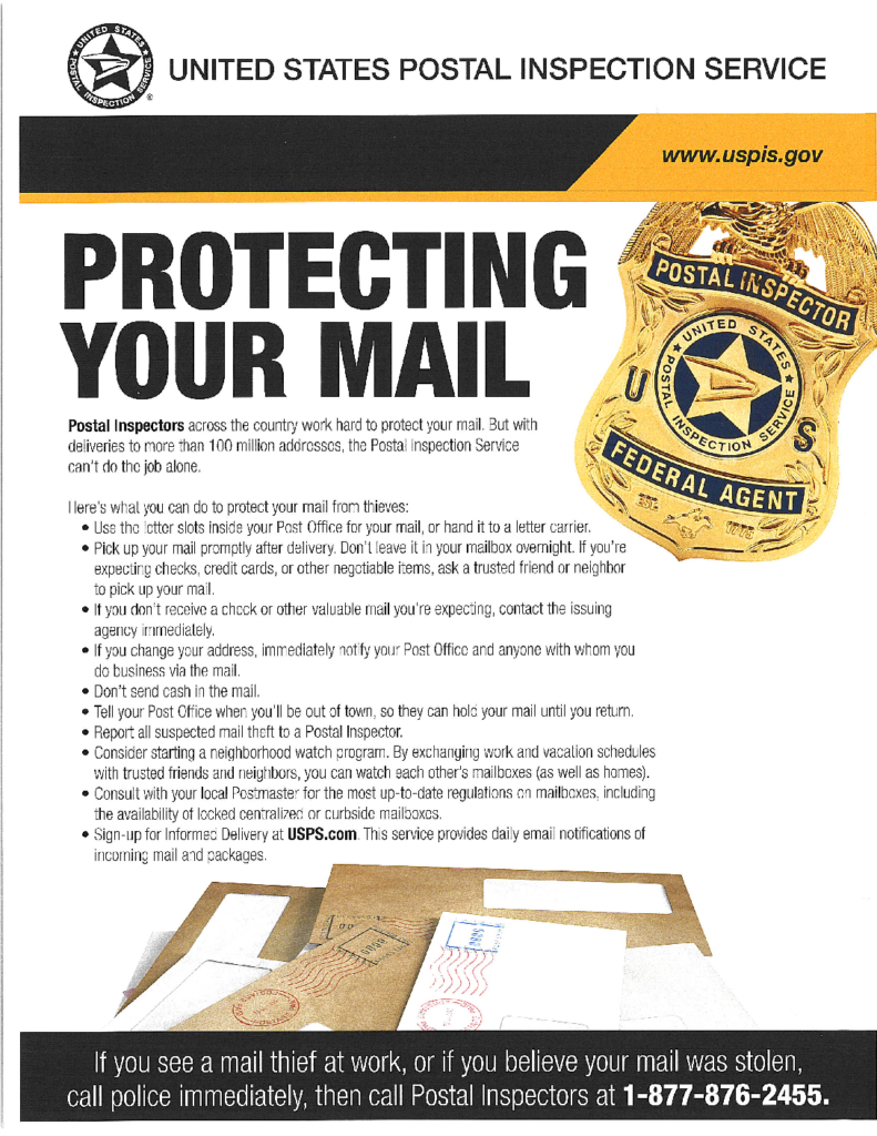If you see a mail thief at work, or if you believe your mail was stolen, call police immediately, then call Postal Inspectors at 1-877-876-2455.